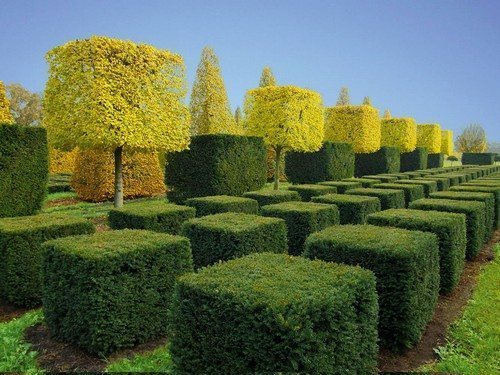 Формы кроны саженцев могут быть разнообразными: кубическими, шарообразными, параллелепипедными или конусовидными. Особенно привлекательно смотрится комбинация растений разных размеров и с различной структурой кроны. Например: